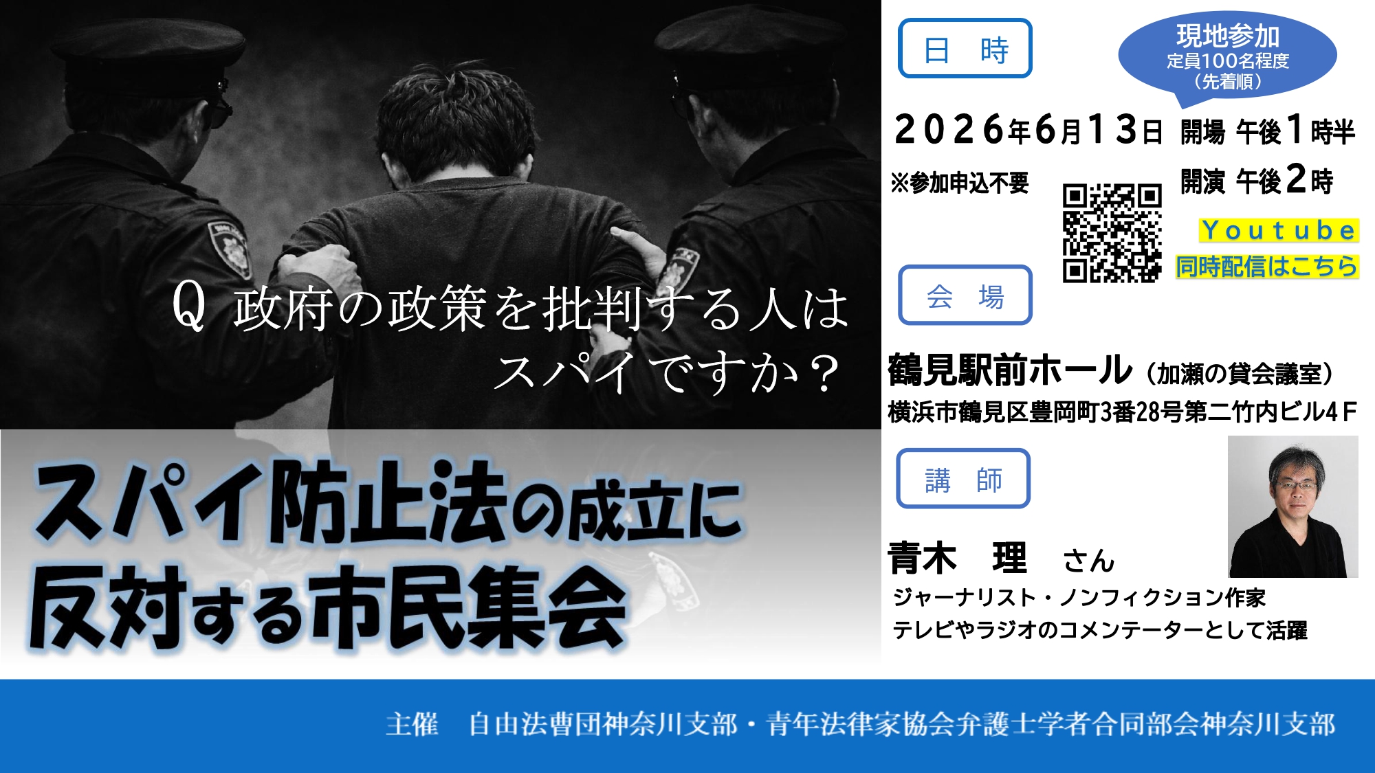 現地参加先着100人程度、参加申込不要、参加費無料、YouTube同時配信