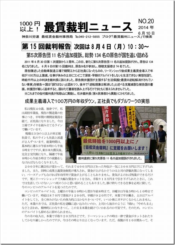 第5次原告団 11 名が追加提訴。総勢 134 名の原告が国を追い詰める 2011 年6 月30 日第1 次提訴から 3 周年。この日、新たに第5次原告団11 名の追加提訴がされ、原告は 134 名になりました。 6 月9 日の第15 回裁判は、原告9名が参加し、傍聴支援者は 74 名でした。