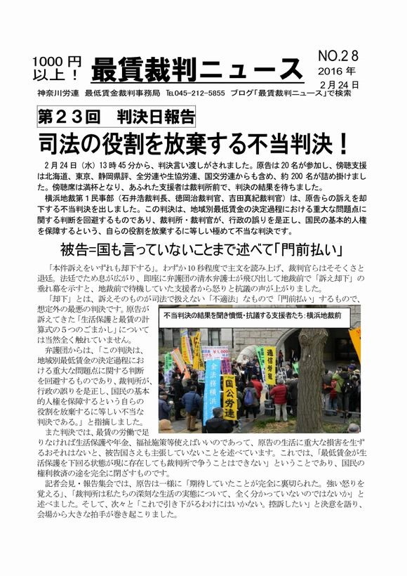横浜地裁第1民事部(石井浩裁判長、徳岡治裁判官、吉田真紀裁判官)は、原告らの訴えを却下する不当判決を出しました。この判決は、地域別最低賃金の決定過程における重大な問題点に関する判断を回避するものであり、裁判所・裁判官が、行政の誤りを是正し、国民の基本的人権を保障するという、自らの役割を放棄するに等しい極めて不当な判決です。
